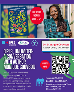 Join Dr. Couvson, acclaimed author of Girls, Unlimited, as she provides expert advice for emerging female changemakers and presents her vision for a future where all girls are valued, heard, and supported. Participation is open to youth who identify as girls (ages 17–24) and advocates or organizations dedicated to their advancement.