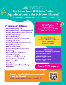Chicago teens ages 14-18 get ready to learn new skills, make friends, and EARN a $200 stipend! Apply to ASM's Spring Preview programs taking place at After School Matters @ Orleans | 1065 N. Orleans St, Chicago. Programs run: January 12 – February 5. Apply now: afterschoolmatters.org/apply.